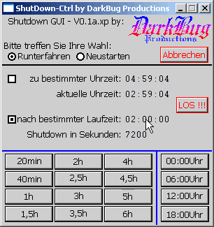 Windows-XP verfügt über ein Programm, welches den Rechner nach Ablauf der eingestellten Sekunden runterfährt, bzw. neustartet.